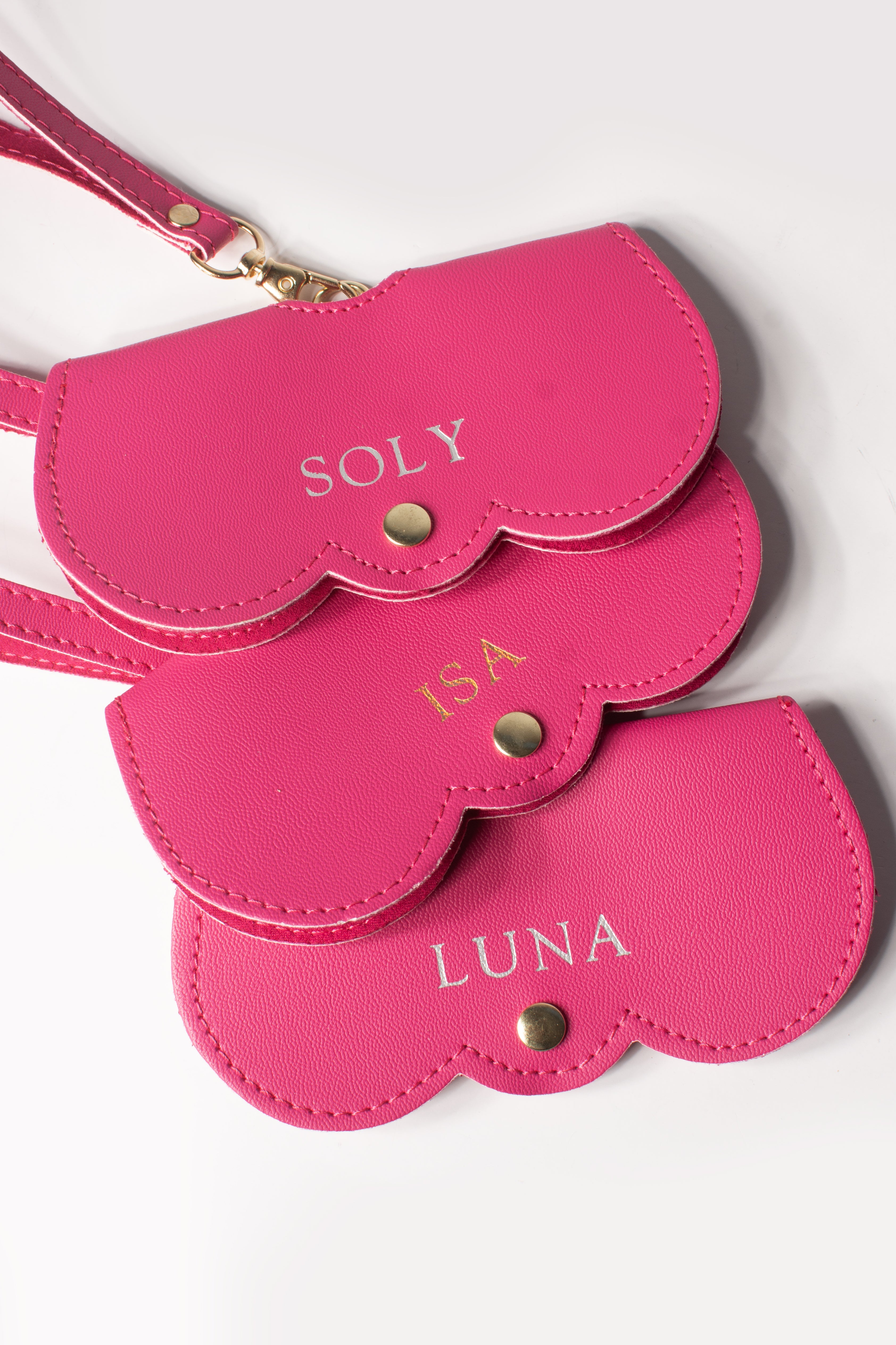 Asa redonda en la parte superior y correa al hombro. Bolsa interior y forro suave. Letra colgante personalizada.